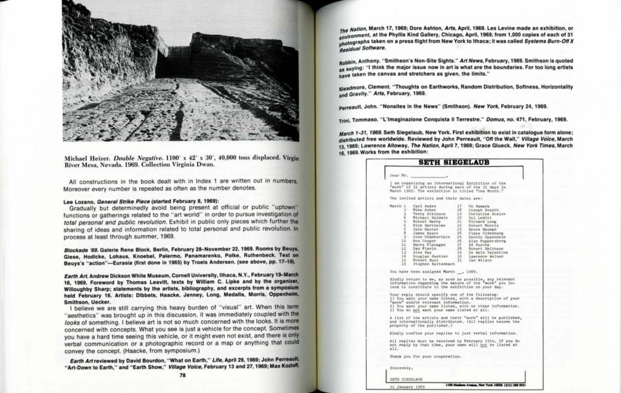 Since its first publication in 1973, and especially after its reprinting in 1997, Lippard's book has become the definitive and indispensable history of conceptual art's genesis, first flourishing, and (arguably) its disintegration and dispersion in the early 1970s. In its formal mimicry of the art that it documents — a mixture of detached, exhaustive information about exhibitions, publications, and events with frequently personal (if understated) editorializing and commentary — it refects Lippard's blurred identity as curator, writer, critic, and quasi-artist (though she disavowed the last role). In filtering a tremendous volume of factual material through her own experience, sensibility, and history, she follows the conceptual tendency to blur rationalist, bureaucratic procedures with arbitrariness and eccentricity, while also demonstrating her allegiance to conceptual art's attack on the institutions of critical connoisseurship and gatekeeping. As artists assumed the role of critic, philosopher, or simply presenter of information-as-art, they bypassed traditional criticism's methods and standards of evaluation. As Lippard wrote in the 1968 essay on dematerialization that she co-authored with John Chandler, “Judgment of ideas is less interesting than following the idea through.” Accordingly, Six Years is exactly that kind of “following-through”: Lippard presents textual fragments and photographic documents that are presumed to speak (mostly) for themselves. This linguistic model, in which art and its form of presentation are collapsed into the same “primary source” and in which juxtaposed elements (textual or not) function like parts of a sentence (as a proposition or argument) constitutes one of the major shifts in 20th-century art that Six Years both records and enacts. A statement made by Ian Burn and Mel Ramsden in 1970 and included in the book is illustrative: “the area of attention is shifting from single iconic elements (art-objects, art works) to comprise a whole continuum of these elements in a sign-process (semiosis).” (136)