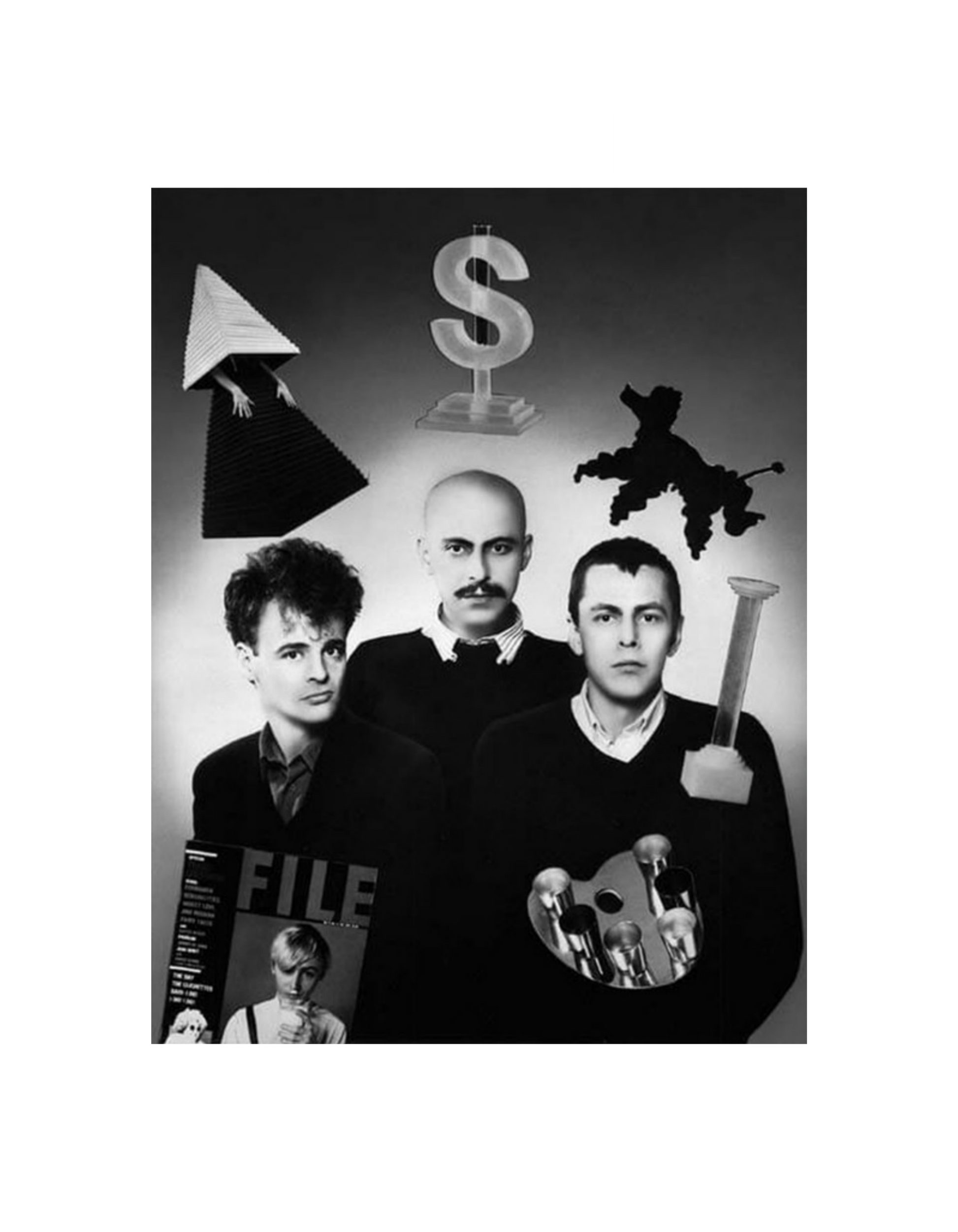 This shirt reproduces GI's Self-Portrait with Objects of 1982, a work made during a period when the group had begun to attract international recognition, including their first solo museum exhibition at the Stedelijk Museum in Amsterdam and appearances at the 1980 Venice Biennale (at a group show in the Canadian Pavilion) and 1982 Documenta 7 in Kassel. The objects featured with Bronson, Zontal, and Partz are representations of General Idea’s key works and iconography to date: FILE Megazine; a V.B. Gown; a poodle, and the cocktail holders Liquid Assets, Architectonic, and Magic Palette. This portrait demonstrates the self-reflective direction that General Idea’s works took in the mid-1980s.