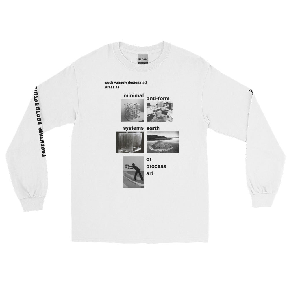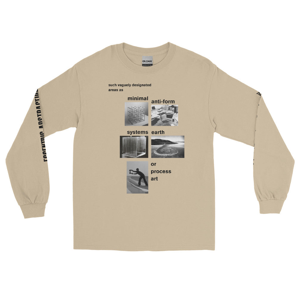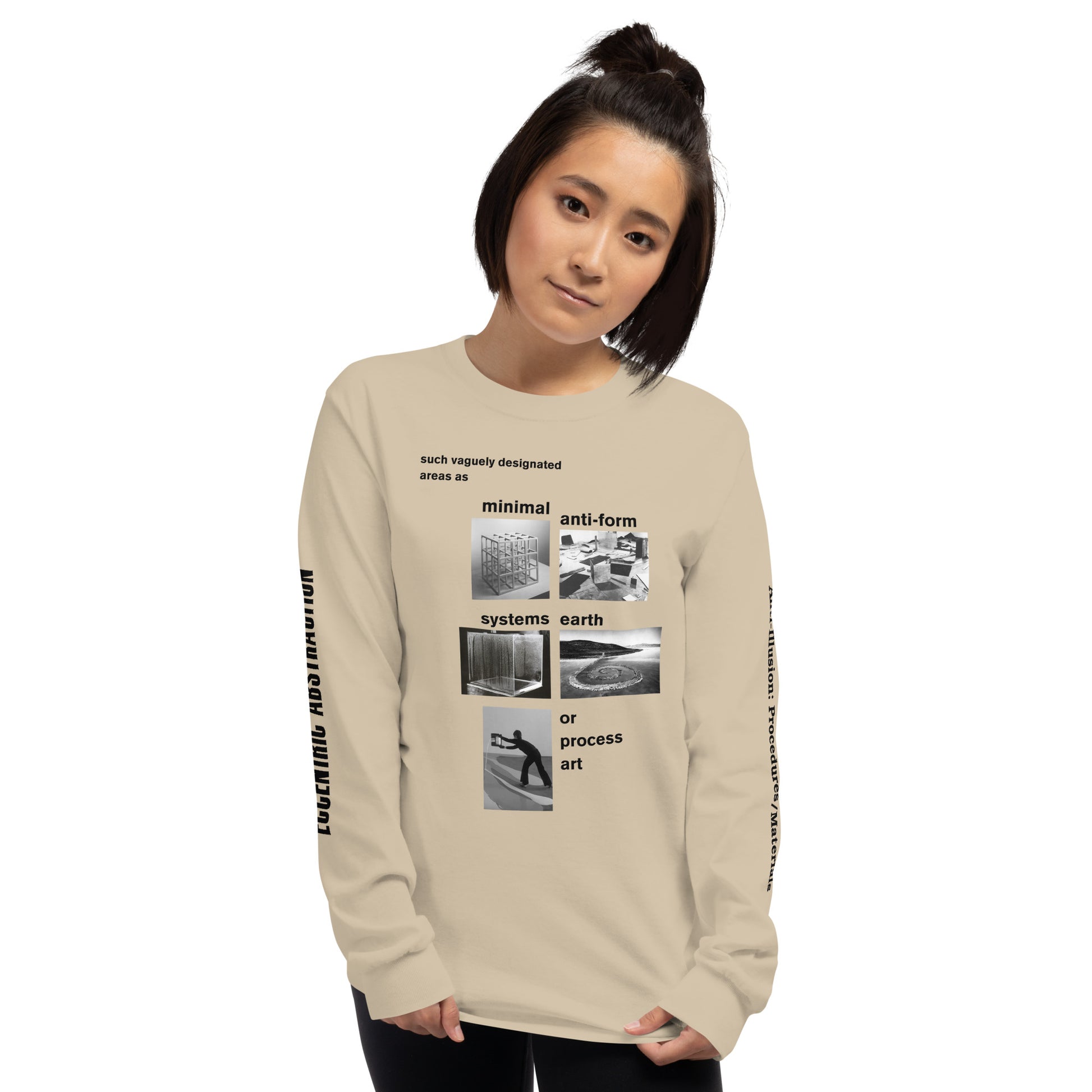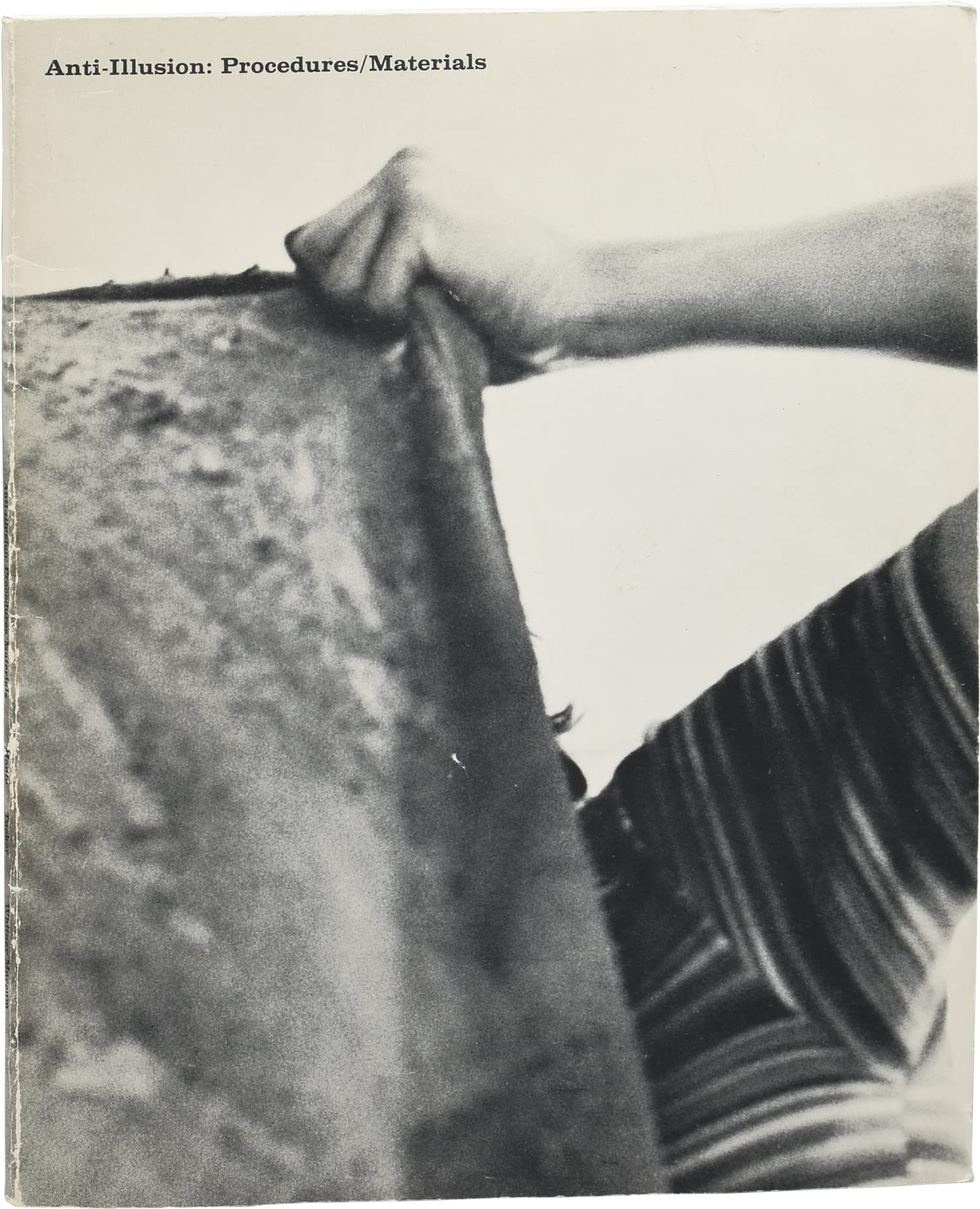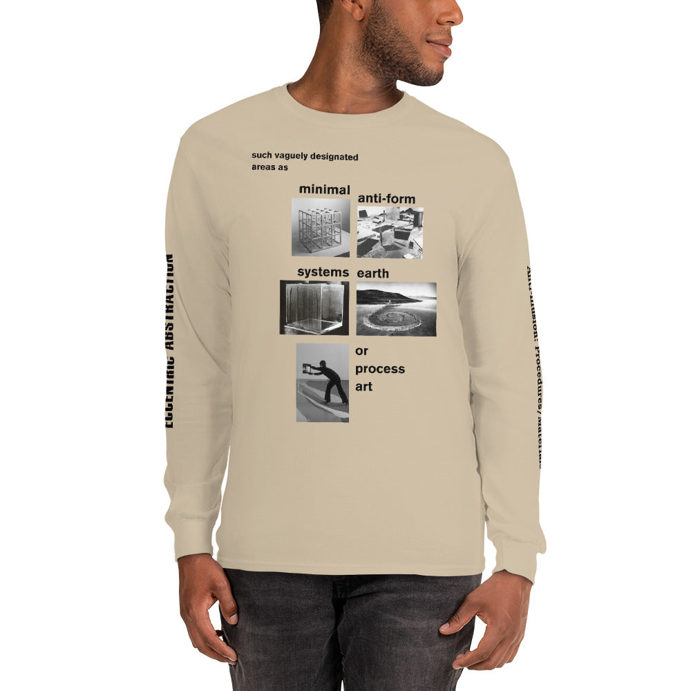 The right sleeve features the original text from the exhibition invite for Lippard's Eccentric Abstraction show (1966-67) of post-minimalist sculpture, while the left sleeve features the title (in a facsimile of the original font) from the 1969 Whitney Museum exhibition Anti-Illusion: Procedures/Materials, one of the first major surveys of process art.