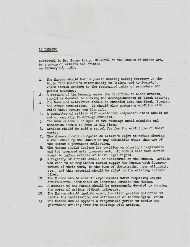The AWC grew out of an incident at MoMA during an exhibition curated by Pontus Hulten, The Machine at the End of the Mechanical Age. On January 3, 1969, Greek kinetic sculptor Takis, with the support of friends, physically removed his work from the exhibition. Although the work, Tele-sculpture (1960), had been purchased by the MoMA in 1963 and thus belonged to its permanent collection, Takis was unhappy with the museum's lack of consultation in choosing a work for exhibition which he considered no longer adequately represented his current artistic practice. The artist took his work into the museum's sculpture garden and remained there until he received confirmation from museum officials that his work would be withdrawn from the exhibition. The incident led to a series of meetings held at the Chelsea Hotel in which the group that had supported Takis's action discussed issues relating to the political and social responsibility of the art community. The group included Takis, American kinetic sculptor Wen-Ying Tsai, German conceptual artist Hans Haacke, American writer and independent curator Willoughby Sharp, co-founder of Avalanche magazine Liza Bear, American artist and Village Voice art critic John Perreault, and American minimalist artist Carl Andre. On January 28, 1969, the AWC presented MoMa's director Bates Lowry with a list of 13 demands.