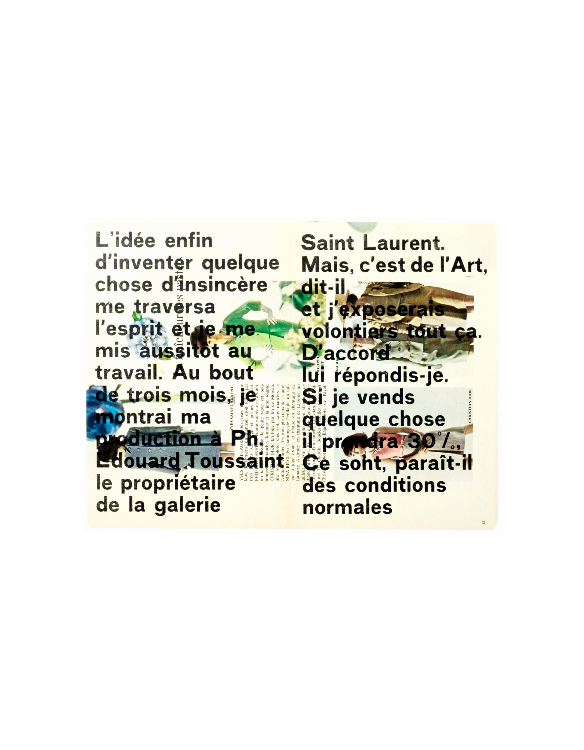 "I, too, wondered whether I could not sell something and succeed in life. For some time I have been good for nothing. I am forty years old . . . Finally the idea of inventing something insincere crossed my mind and I set to work straightaway. At the end of three months I showed what I had produced to Edouard Toussaint, the owner of the Galerie Saint Laurent. 'But it is art,' he said 'and I will willingly exhibit all of it.' 'Agreed,' I replied. If I sell something he takes 30%. It seems these are the usual conditions, some galleries take 75%. What is it? In fact, objects."