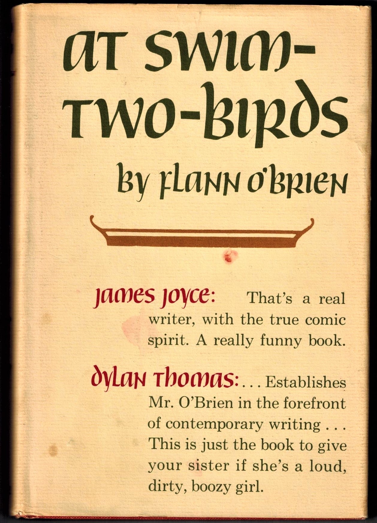 This design for this hat is inspired by the Walker & Co. 1966 US edition of O'Brien's At Swim Two-Birds, best distinguished for its dust jacket front cover quotes by James Joyce and Dylan Thomas, who wrote: "Establishes Mr. O'Brien in the forefront of contemporary writing. This is just the book to give to your sister if she's a loud, dirty, boozy girl."