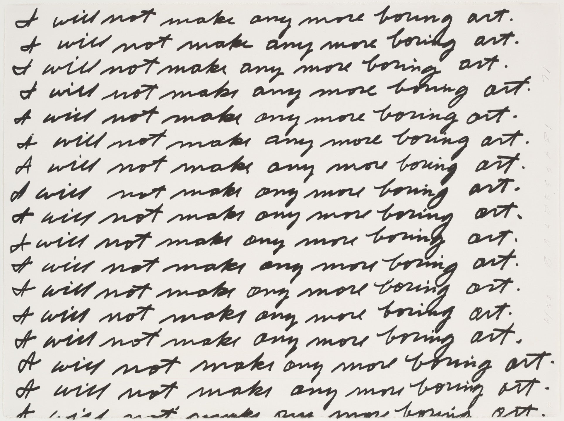Baldessari points out that language has made-up rules that we all agree to follow. Conventional notions of art may be as ingrained, passed down, and unquestioned as rules of language, but artists like Baldessari aimed to show that they are equally arbitrary, and open to interpretation. Baldesssari described his conceptual works as “what I thought art should be, not what somebody else would think art would be. You know, received wisdom, what you would get in school. And so a lot of my work was about questioning this received wisdom.”