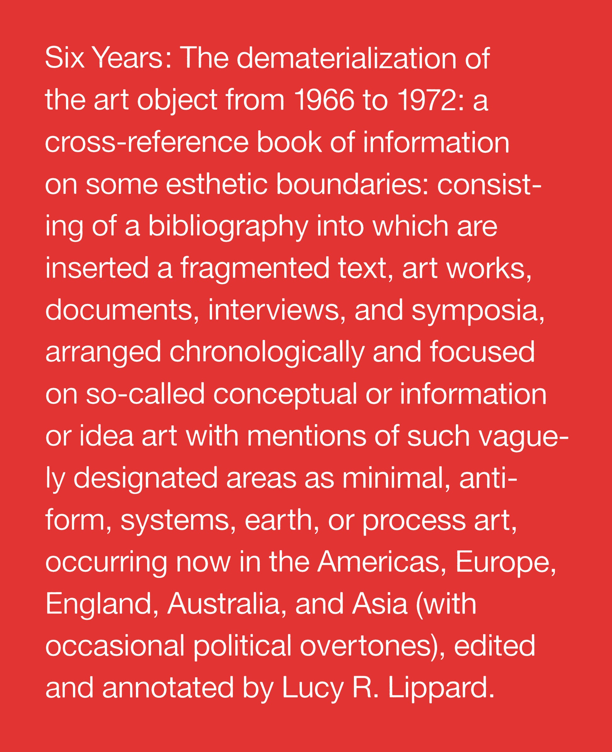 In 1973 the critic and curator Lucy R. Lippard published Six Years, a book with possibly the longest subtitle in the bibliography of art: The dematerialization of the art object from 1966 to 1972: a cross-reference book of information on some esthetic boundaries: consisting of a bibliography into which are inserted a fragmented text, art works, documents, interviews, and symposia, arranged chronologically and focused on so-called conceptual or information or idea art with mentions of such vaguely designated areas as minimal, anti-form, systems, earth, or process art, occurring now in the Americas, Europe, England, Australia, and Asia (with occasional political overtones) edited and annotated by Lucy R. Lippard. Six Years, sometimes referred to as a conceptual art object itself, not only described and embodied the new type of art-making that Lippard was intent on identifying and cataloging, it also exemplified a new way of criticizing and curating art.