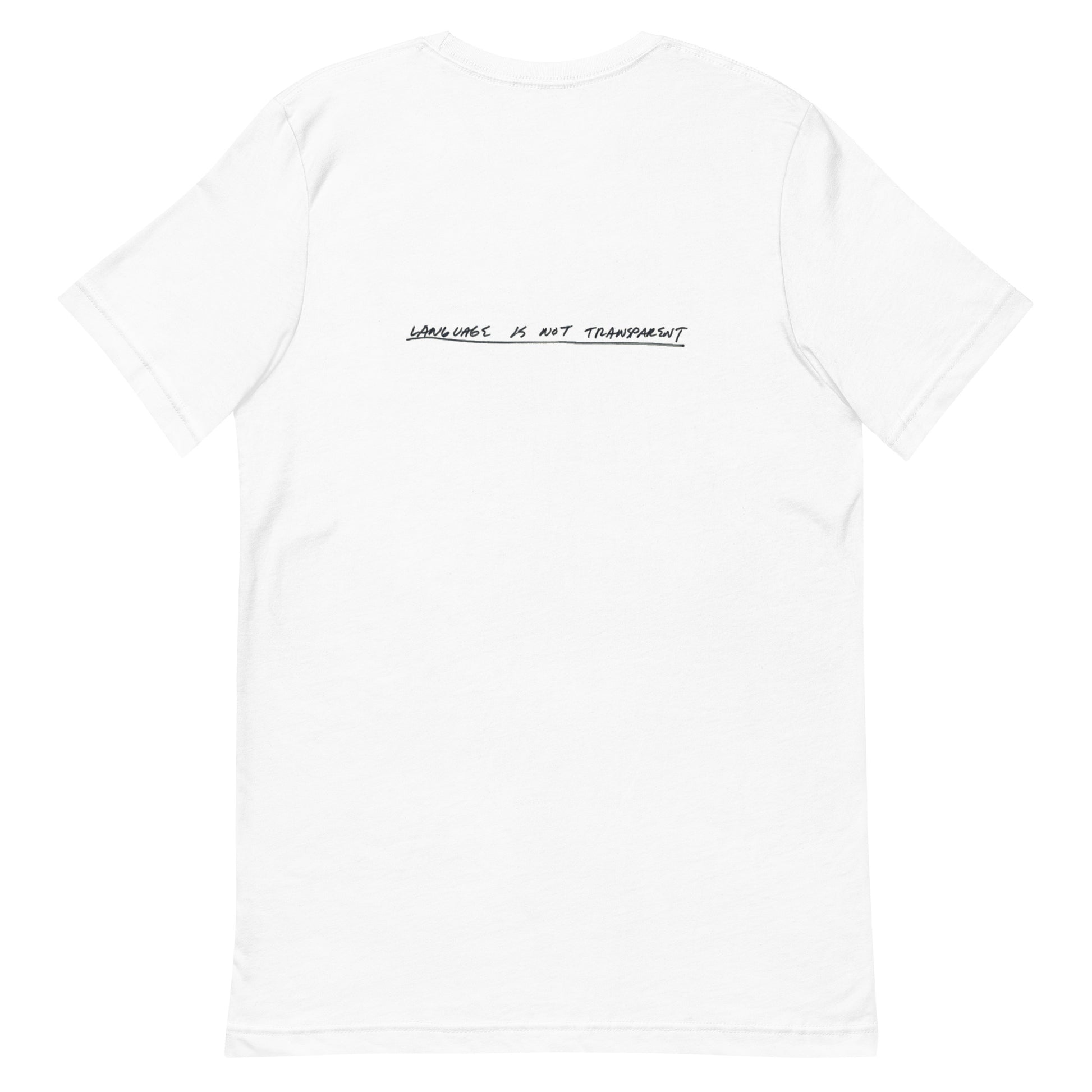 This t-shirt reproduces an often-quoted observation of Bochner's, originally recorded on a notecard, that "no thought exists without a sustaining support." Despite being regularly identified as a conceptual artist, Bochner was often included in exhibitions and anthologies of the movement as a kind of dissenting voice asserting the continued existence and/or significance of art's material elements. As the back of this shirt also asserts (with a phrase drawn from the same notecard), "language is not transparent."