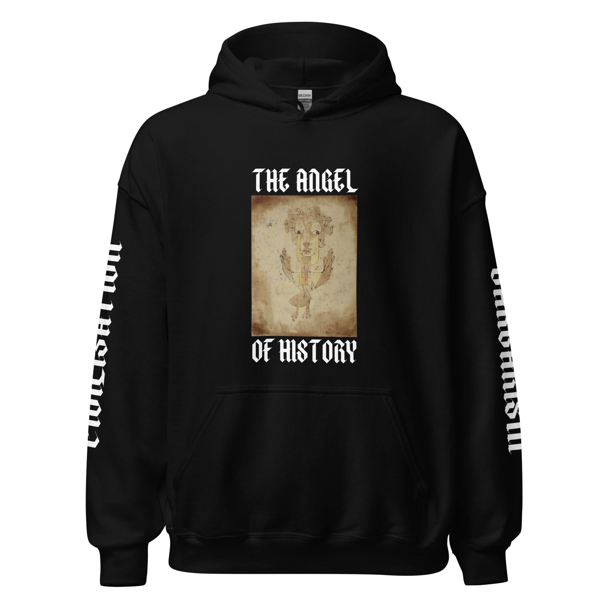 This paragraph is reproduced on the back of this hoodie. The right sleeve reads "there is no document of civilization," and the left reads, "which is not at the same time a document of barbarism." The lettering is in a contemporary version of the blackletter type which was common in Western Europe until the 17th century and is particularly associated with Germany, where the use of blackletter continued well after most European countries had stopped using it in favour of more modern typefaces. Under the Nazis, blackletter type was discontinued by an "edict on script" (Schrifterlass) in 1941, as Hitler deemed it "Jewish-influenced."